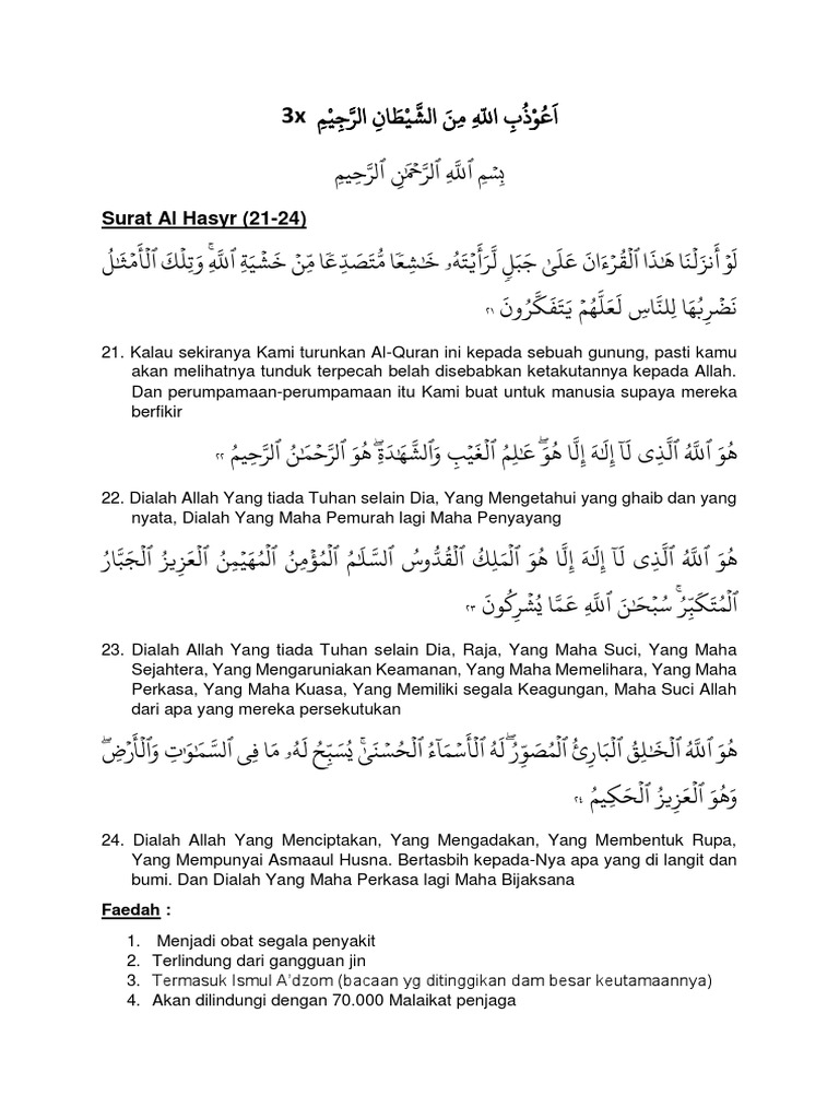 Jumlah ayatnya ada 24. Fadhilah khasiat surat Al Hasyr ayat 21-24 terakhir - Terdapat fadhilah dan khasiat surat Al Hasyr ayat 21-24 yang menakjubkan sekali. Surah al hasyr 21 24.
