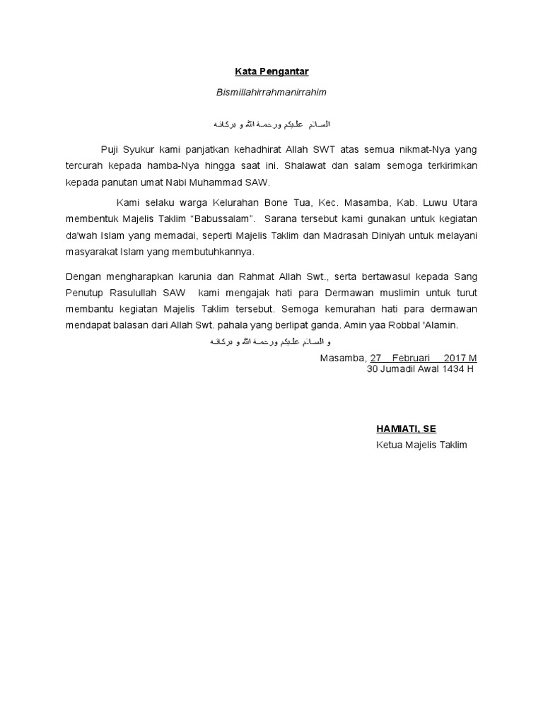 Contoh proposal kegiatan majelis taklim. Admin dari blog Temukan Contoh 2019 juga mengumpulkan gambar-gambar lainnya terkait contoh proposal bantuan dana kegiatan majelis taklim dibawah ini. LATAR BELAKANG MASALAH Kekayaan dan. PROPOSAL MAJELIS TALIM AL HIDAYAH Inha Regina Majelis Talim dan masjid merupakan kombinasi yang sangat penting dalam sendi-sendi kehidupan masyarakat muslim pada khususnya selain dalam rangka penghayatan pengamalan dan pelaksanaan ajaran agama juga sebagai peneguhan syiar-syiar agama Islam.