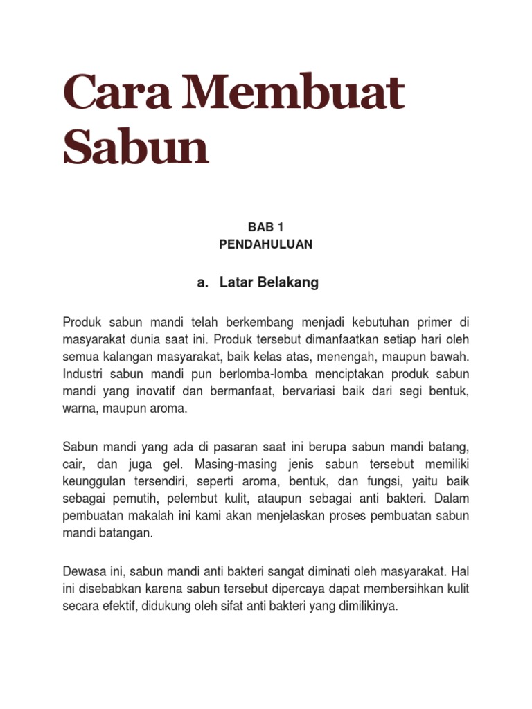 Makalah pembuatan sabun cair BAB I PENDAHULUAN 1. Cara membuat sabun cuci piring cair sederhana cukup mudah. Pada percobaan pembuatan sabun didapatkan sabun akibat dari pencampuran dan pemanasan NaOH minyak kelapa air dan diendapkan oleh larutan NaCl.