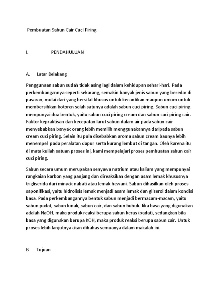 Sabun cair yang Anda dapatkan dari cara membuat sabun cuci cair di bawah ini dapat Anda gunakan sebagai sabun mandi sabun cuci tangan atau bahkan mencuci baju misalnya baju bayi. LAPORAN PENGABDIAN MASYARAKAT DANA DIPA FAKULTAS SAINS DAN MATEMATIKA UNDIP TAHUN 2015 PELATIHAN PEMBUATAN SABUN CUCI PIRING Oleh. Tujuan utama dari pembuatan laporan praktikum ini yaitu untuk memenuhi salah satu tugas terstruktur mata kuliah Kimia Industri dengan bahasan laporan mengenai Pembuatan Sabun Mandi Cair.