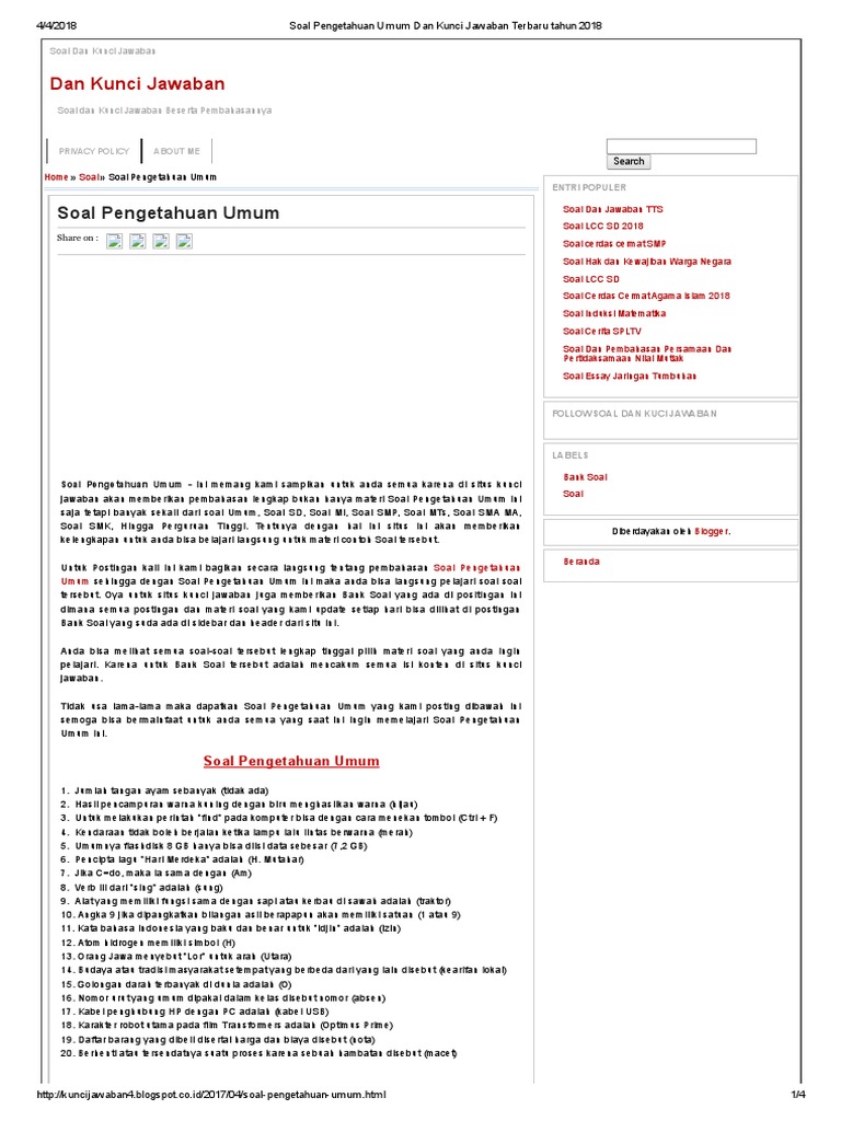 Soal Pengetahuan Umum Dan Kunci Jawaban Terbaru Tahun 2018
